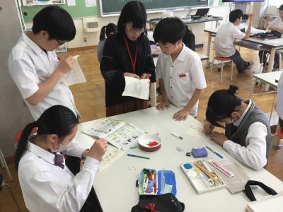 2年生社会の授業では、生徒たちが「東京は〇〇の中心」というテーマでカードを作成し、友人同士で交換しながら交流を深めました。