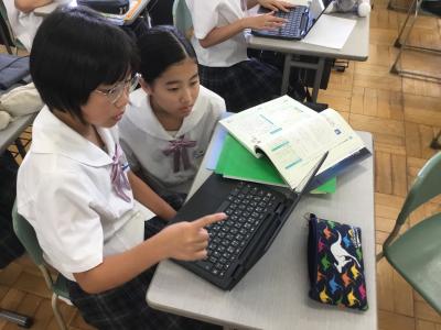1年生の英語の授業では、Chromebookを使って、サイトトランスレーション(即興で話すための練習)を行っていました。Chromebookの画面にあるキーワードをもとに、英語での再表現にチャレンジしました。