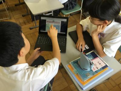 社会科の授業では、I C Tを活用して単元全体のリフレクションを行っていました。 I C Tを活用することで、自分だけでなく、クラスメイトのリフレクションの内容も共有することができます。