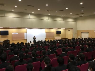 1年生120人が全員集い、本校の視聴覚室で学年開きが行われました。新学期の2日目なので、クラスは同じでも、まだ、話したことのないクラスメイトの方が多く、少し緊張気味の様子も見られました。