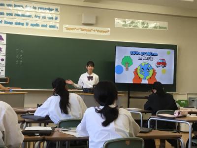 自分が伝えたいことを、これまで身に付けてきた英語力で、いかにシンプルに、わかりやすく伝えることができるかは、英語で表現するための大切な力です。わかりやすい英文と、その内容に合ったわかりやすいスライドがモニターに映り、さすが英語部のみなさんの発表でした。