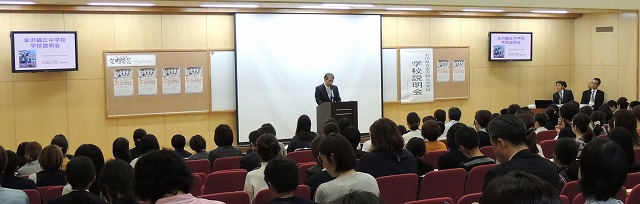 説明会では、中学教頭が中高一貫教育校としての特色や利点、教育内容などの説明をしました。その後、高校の進路指導担当が、高校3年間の流れや進学についての説明をし、最後に中学教務主任から入学者選抜の手続きについての話がありました。大勢の保護者と児童の皆様が参加してくれたことに本当に感謝致します。ありがとうございました。