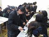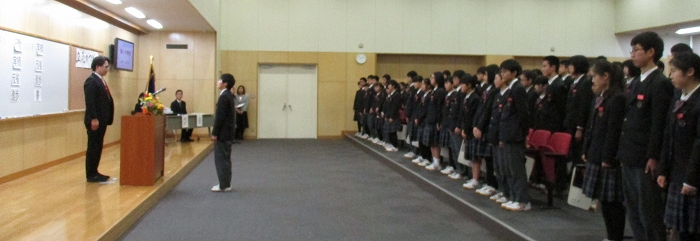 2月15日(水)、2年生対象に「立志のつどい」が開催されました。PTA会長や校長先生から励ましの言葉をもらった2年生代表生徒は、「夢や希望をもち、周りの人に対する感謝の気持ちを忘れず、次代の社会を担うものとしての誇りと自覚をもち、社会に貢献していきたい」と誓いの言葉を述べました。教室に戻り、PTA役員の方のご協力の下、記念品製作を行いました。