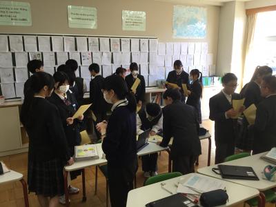 今日は、自分が1番いいと思ったポスターの作成者に、自分の意見を伝える時間でした。どの生徒も、とてもいきいきと自分の意見をのべていました。