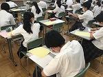 合唱コンクール本番を午後に控えた午前中、全学年全クラスで、人権教育の一環として「人権作文」に取り組みました。 過去の全国中学生人権作文入賞作品の1つを鑑賞、感想交流を行った後、1人1人が各自のテーマに沿って作文に取りかかり始めました。ぴんと張り詰めた心地良い緊張感の中、真剣に原稿用紙に向かう姿が、全クラスで見られました。写真上段:1年 中段:2年 下段:3年