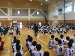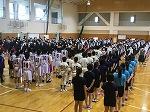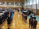 吹奏楽部の演奏で選手入場、各部部長から大会に臨む力強い決意表明がありました。決意表明の後は、2年リーダー会が中心となっての応援エールと全校生徒による校歌合唱で、選手達を激励しました。続いて、生徒会長、校長先生から激励の言葉がありました。最後に部活動担当の先生より大会期間中の確認がありました。