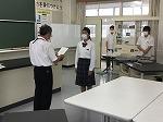全校朝礼に引き続き、表彰披露を行いました。新人大会やコンクール、全国大会や世界大会など、多くの皆さんの活躍を大変うれしく思います。大会前の練習では、3年生が指導してくれたり、高校生が指導してくれたりと、1、2年生にとっては、とても心強い応援がありました。優勝や入賞できた生徒の皆さん、おめでとうございます。あともう少しで入賞だったという皆さん、次の大会に向けて、個人あるいはチームとしての力を積み上げていってください。