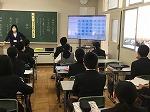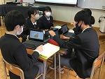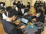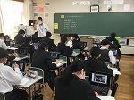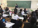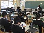 平家物語を学習中。文章中の係り結び等に着目しながら、与一の決意が感じられるところについて考えました。自分の考えをペアで交流し、積極的に自分の考えを発表、全員が集中して授業に臨んでいる空気が教室に満ちていました。