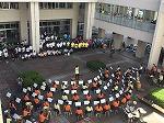 高校1年生のステージ発表のあとは、NISHIKIスクエアに移動して、中学校、高校吹奏楽部ステージ。軽快な演奏で、紫錦祭を盛り上げてくれました。先生方も、中学校演奏の緑黄色社会の「Mela!」、高校演奏の星野源の「恋」に合わせて華麗なダンスを披露。短期集中の練習が実を結び、見事なダンスでした。