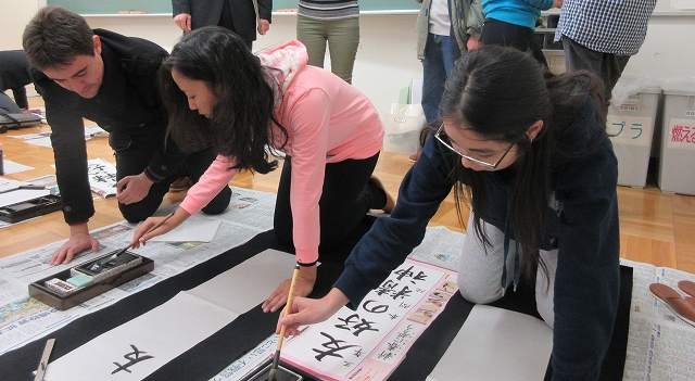 ブラジルやアルゼンチンから海外県人会青少年育成交流事業で4名の中高生が来校しました。書き初め競書会で書き初めに挑戦した後、本校の生徒会役員と意見交流しました。英語や日本語も交えながら、互いに自己紹介したり、日本とブラジルに対する印象について話し合い、ブラジルでは雪を見たことがなく、生徒会役員が小さい頃にした雪遊びの話をすると、興味深そうに聞いていました。