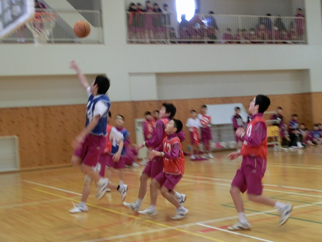 インフルエンザの流行のため、延期になったバスケットボール大会ですが、大会当日は元気なプレーと応援で大変盛り上がりました。縦割りの部では1C・2A・3Bの赤団が優勝!学年の部では1年生はC組、2年はA組、3年はA組がそれぞれ優勝しました。今年度から縦割り行事となった球技大会ですが、3年リーダーが中心となり団の応援など、学年を超えた交流で全校が1つとなった大会となりました。
