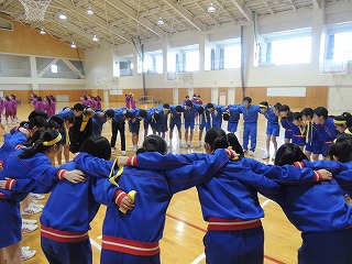 赤、青、黄色の3団の縦割りに分かれた各学年の生徒たちによる応援合戦に始まったバスケットボール大会は、大変な盛り上がりで終えることができました。競技の結果の1位は1年B組、2年C組、3年A組で、総合は黄団(1年C組、2年C組、3年A組)が優勝しました。