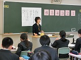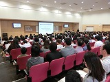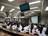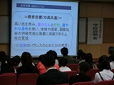 説明会では、中学教頭が中高一貫教育校としての特色、自校ミッション、特色のある取組み、錦丘ブランドなどの説明をしました。その後、高校の進路指導担当が、高校3年間の流れや進学についての説明をしました。