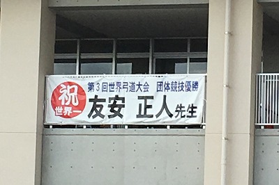4/24.25の世界弓道大会で優勝した本校の友安先生が、TVの取材を受けました。