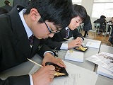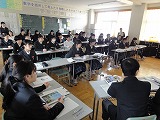 2月21日(木)の午後、EIZO株式会社、北陸銀行、北陸先端科学技術大学、金沢工業大学、金沢星稜大学、北陸大学、金沢学院大学、金城大学、北陸学院大学、金沢星稜女子短期大学、小松短期大学の方をお招きしてグループ別キャリア教育を行いました。全学年を縦割りの13のグループに分け、司会や記録などの運営も生徒自身で行いました。真剣に話を聴いたり、積極的に参加して、その後の感想発表でも意欲的に自分の考えを発表していました。