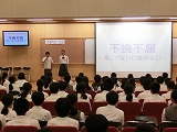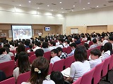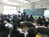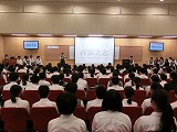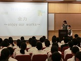 説明会では、中学校教頭が中高一貫教育校としての特色、自校、ミッション、特色のある取組、錦丘ブランドなどの説明をしました。その後、高校副校長が、高校3年間の流れや進学についての説明をしました。