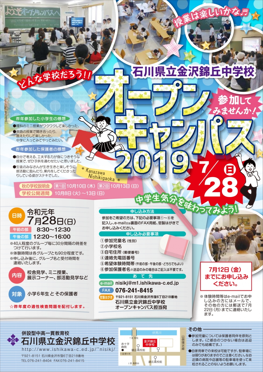 今年も金沢錦丘中学校オープンキャンパスの時期がやってきました。現在各小学校に向けてリーフレットの発送準備をしております。しばらくお待ちください。また、本ホームページからダウンロードすることできます。FAXまたはEメールでお申し込みください。多数のご参加お待ちしております。