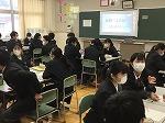 生徒会執行部からの目的・テーマ説明、事前アンケート結果、SNSトラブル事例再現等のプレゼンテーションに続き、約40分の学級討議を行いました。どの学級においても、大変熱心な話し合いが繰り広げられました。