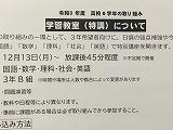 来週13日(月)より、高校0学年の取組の1つとして、3年生の希望者対象に、日頃の弱点補強や今後の対策のために、「国語」「数学」「理科」「社会」「英語」の5教科で、特別講座をスタートします。放課後45分程度、問題演習等を中心に行います。開催日は不定期ですが、開催予定日は事前に生徒に知らせます。来週は、英語、数学、国語の特講を予定しています。1人1人が、中学3年間の学習をしっかりと定着させて、4月を迎えて欲しいと思います。