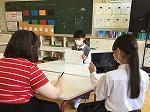今日の課題は、「知らない人や知らないことをたずねるには」でした。授業冒頭では、1年担当の先生達の情報を見て英語で表現、先生達の意外な特技に驚きの声。続いてジェシカ先生の好きなこと(食べ物、教科など)をI think she likes ~で予想。答えを聞いて、こちらも歓声や驚きの声。このレッスンでは、疑問詞を用いた疑問文を学習しています。英語を用いて表現できることが少しずつ増えていきますね。