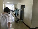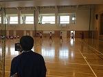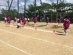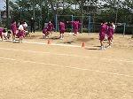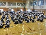 今日は、2グループに分かれての実施。ひとグループは第一フロアで、伝統の錦丘体操のビデオ撮りに、各グループ取り組んでいました。どのグループも息ぴったりでした。もうひとグループは、グランドで走幅跳びに取り組んでいました。今までの練習で確認した自分の助走位置からスタートし、上手に踏切板に足を合わせて飛んでいました。自己記録更新を目指して、頑張れ。