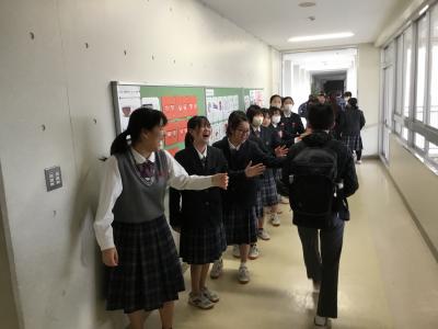 3年生は、国語科で学んだ“合意形成”を用いて、自分達でできる「学校のみんなにとっていいこと」を企画し、実行にうつしてくれました。今週は、3年1組のみなさんが実行します。中学校棟に向かう渡り廊下で、朝のハイタッチ運動をしていました。登校したみんなをハイタッチの挨拶で元気にしようという取り組みです。