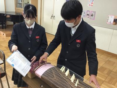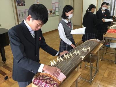 音楽室から箏の演奏による「さくらさくら」が聴こえてきます。「そこに箏があったら、さっと調弦し、1曲演奏できる日本人でありたいですね。」という先生の言葉に感化された生徒達は、何度も繰り返し練習に励んでいました。