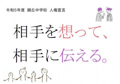 今年度の人権集会のテーマは「安心して学校生活を送るには」でした。それぞれのクラスからは「コミュニケーション」「相手を思う」「雰囲気」「より良い人間関係」という言葉が多く出ました。生徒会では、この人権集会でみなさんから出てきたアイデアをもとに「金沢錦丘中学校 人権宣言」 として形にしました。今年度の人権宣言は「相手を想って、相手に伝える」です。この宣言を考えるうえで、各クラスの考えを一つ一つ、キーワードで起こし、大切なことをまとめ「学校生活をよりよくしたい」という想いで、この人権宣言を決めました。