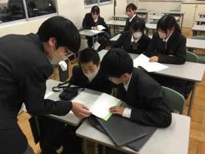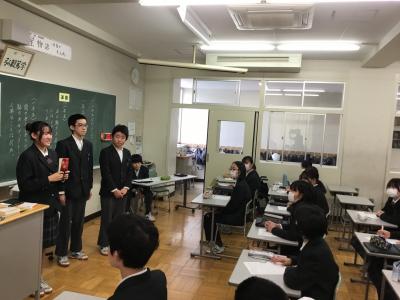 2年生のコミュニケーション国語では、1年生に向けてブックトークを行いました。自分が好きな本ということもあり、どの生徒も自分の言葉でうれしそうに紹介してくれました。すぐ手にとって読んでみたくなるような紹介ばかりで、1年生もとても興味をもって真剣に聞く姿が見られました。