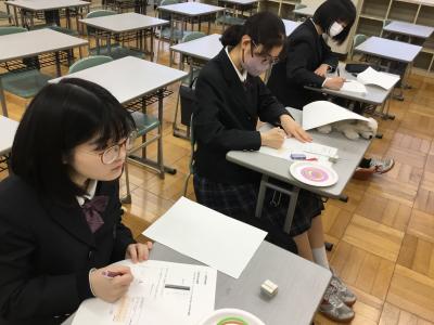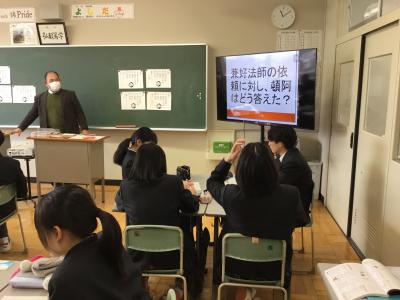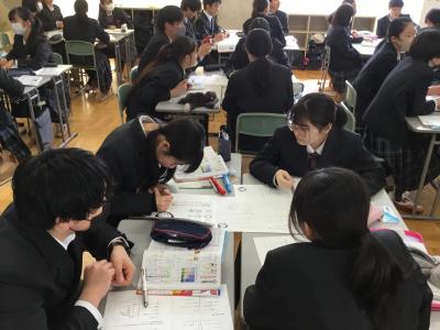 「古典」の授業では、兼好法師の『徒然草』から、古典の世界を楽しみました。兼好法師は、三大随筆の筆者であり、二条為世の和歌四天王といわれていますが、いろいろな面白いエピソードも残っているそうです。今日は、謎解きのような折り句(かんむり、くつ)について“分かるもの同士の楽しみ方”を紹介してもらいました。(一見、恋人への和歌かと思いましたが、実は・・・)粋な和歌のやりとりに気づくことができたら、謎解きみたいで面白いですね。他の和歌でも調べてみたくなる授業でした