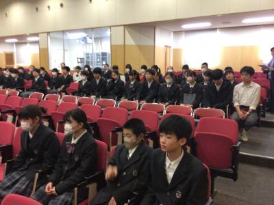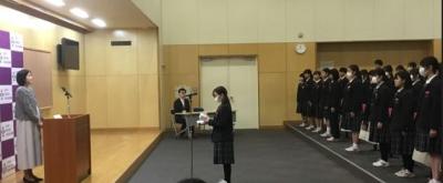 3年生は、金沢錦丘中学校第18期生になります。今日は、同窓会入会が行われました。同窓会代表の第1期生廣部さくらさんに来校していただき、卒業生代表として鵜川凛音さんがあいさつをしました。