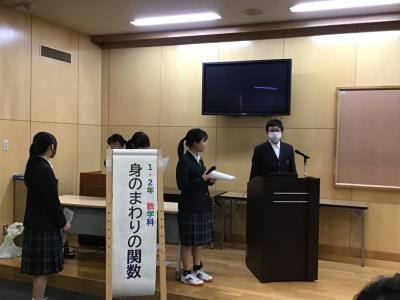 1年生のコミュニケーション国語の授業では、視聴覚室にて、学年代表者によるビブリオバトル大会が行われました。自分のお気に入りの本の魅力が伝わるように、紹介の仕方をいろいろ工夫し、堂々と語る姿は、さすが学年代表でした。