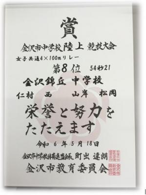 陸上部は、金沢市営陸上競技場にて、金沢市中学校校陸上競技大会に参加しました。この大会は県大会の予選も兼ねています。女子共通4×100mリレーにおいて、見事、8位に入賞し、県大会出場を決めました。