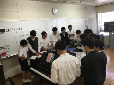 音楽の授業では、3年生の男性パートに参観にきた小学生の子も加わって、楽しく歌いました。1階にある音楽室からの歌声が、3階の職員室にも心地よく響いていました。