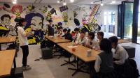 ALTのセバスチャン先生が、全員の作文を見て解説をしながら順に添削してくれました。モニターに写しだされた英文に間違いがあっても「あーそっか」「わかるー」などとつぶやいたり、完璧な英文には「おー!(拍手)」「やったー」などと互いに讃えあったりする姿が見られました。「間違い」も「正解」も自分事として受け止めて、仲間と楽しみながら「次は、カンペキな文をつくりたい!」と意欲的に英作文に取り組んでいます。