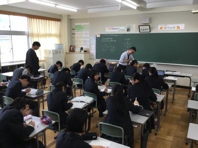 (この時間は都合で、他教科の先生が授業にでてくださっていましたが)今日の学習課題を把握し、既習内容を活用して自分たちで学び合う自律した生徒達のすてきな姿が見られました。