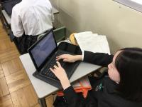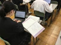 1年生の社会科では、単元のまとめを行っていました。単元のはじめに「単元を貫く課題」を確認しているので、これまで1時間1時間学習してきた内容を振り返り、自分のノートや教科書も参考にしながら、自分の考えを黙々と書いていました。(タイピングしていました。)社会的な見方・考え方を働かせ、自分で解を見出し表現する姿が見られました。自律的に学ぶ生徒のすてきな姿です。