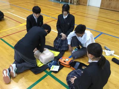 2年生の保健体育の時間に、「傷害の防止」の学習に合わせて、緊急時に適切な対応と協力ができるように日本赤十字の方々をお招きして、心肺蘇生法と学校に設置されているAEDの使用法について講習会をおこないました。
