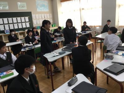 1年生の道徳の時間では「ありがとう」の言葉の不思議な力について、生徒達がグループ対話をしていました。自分の考えを話すと、それを他の仲間がきちんと受け止めて聞いてくれるので、グループ対話の時間はとても楽しそうです。どの生徒も自分らしくのびのびと授業に取り組んでいます。
