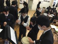 1年生の音楽では「箏」の演奏に取り組んでいます。先生から教えてもらった正しい奏法で弾けるように、ペアでアドバイスし合い、真剣に取り組んでいました。
