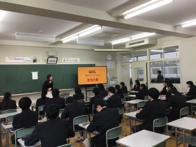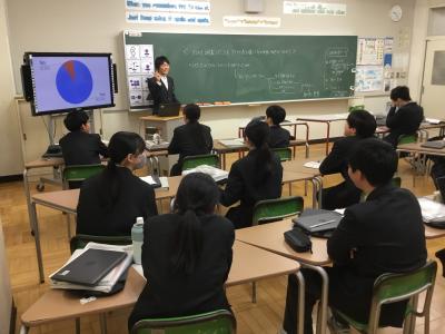 発表の最後には、調査結果やデータを根拠として、英語で感想や考察をのべていました。特に最後の一文は、生徒の自分らしさが表れます。聞いているクラスメートから、英語で伝え笑いまでとることができる表現力に感心しました。