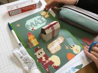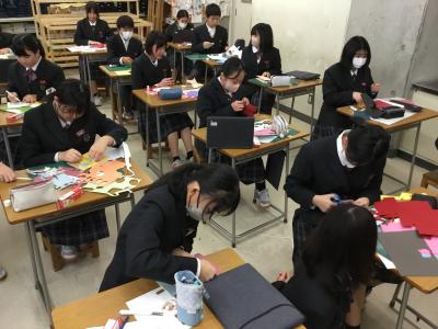 1年生の美術では、家族や友達に贈るポップアップカードを作りました。色画用紙の装飾をいろいろと工夫し、カードを開いた時にどうなったら相手が喜んでくれるかを、試行錯誤していました。