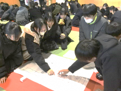 3年生は、日本赤十字社の方をお招きし出前授業をしていただきました。共同作業(ボードゲーム)を通して、自然災害の際、避難所を開設するとどのような課題に直面するかについて考えました。避難所では「避難者自身が動くこと」「ルールを守ること」が大切です。