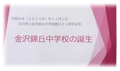 今日は、本校、石川県立金沢錦丘中学校の創立記念日です。2003年(平成15年)11月1日に、石川県立金沢錦丘高等学校に併設した金沢錦丘中学校が誕生しました。2004年(平成16年)4月7日に1期生の入学式を迎えることができました。