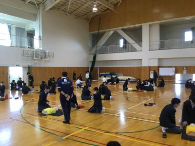 2年生の保健体育の時間に、「傷害の防止」の学習に合わせて、緊急時に適切な対応と協力ができるように日本赤十字の方々をお招きして、心肺蘇生法と学校に設置されているAEDの使用法について講習会をおこないました。