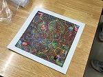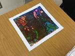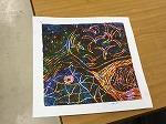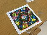 授業を参観した時は、各自が製作した回転版画を鑑賞中でした。それぞれの個性が光る作品が並んでいました。級友の作品の良さや工夫点を自分の版画に生かし、完成を目指します。