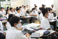3年生は個人で、自分の課題研究テーマについてまとめていました。1学期の学習内容を夏休み中にも継続して深めてきたことから、自分の研究内容が明確になってきている様子でした。先生に自分が困っていることを話し助言を受けながら思考を整理し、少しずつ自信をもって研究を進めていく様子も見られました。