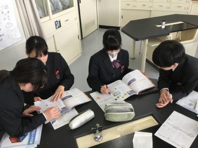 1年生の理科の授業では、課題プリントに取り組んでいました。グループのメンバーでこれまでの学習を基に、教えたり教えてもらったりしながら、正解は何かを話し合っていました。