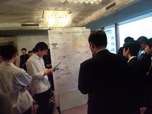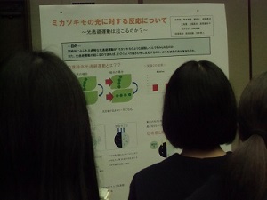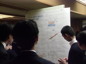 数学班は 「ゲーム理論」「オイラー線」 、生物班は 「ミカヅキモの光に対する反応について」 、物理班は 「ペルチェ素子の性能」 の研究成果を他校生徒に対してポスター発表しました。