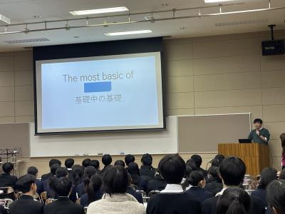 12月27日(木)、視聴覚教室にて二水版クリスマスレクチャーが開かれました。およそ80名の2年生が参加し、本校の卒業生で東京大学の山岸龍一郎さんと京都大学の北見一紗さんによる講演が行われました。山岸さんの大学での核融合に関わる研究生活の様子や、北見さんの大学生活と倫理学の研究の様子を聞き、生徒達は大学で行われる研究活動への興味・関心を高めていました。